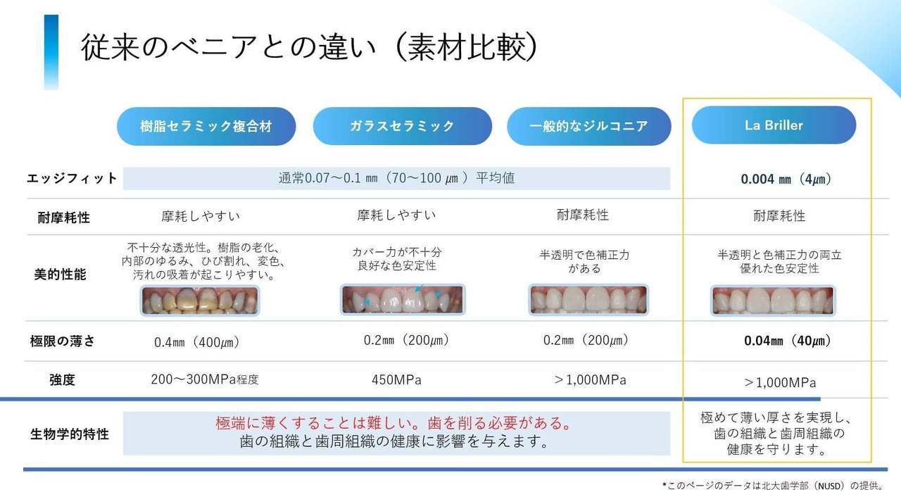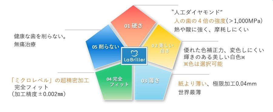LaBrillerは歯を削らずに貼り付けることで歯の色や形を美しく整える、極薄ジルコニアを使用した審美歯科治療法です。主な特徴は歯を削らない、紙より薄い0.04mmという薄さ、人の歯の4倍の強度を持ち、完全フィットすることです。
