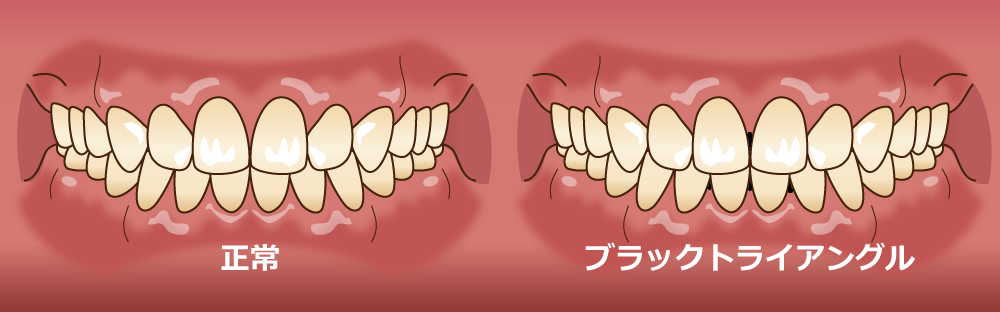 ブラックトライアングルとは、歯茎が下がることによって歯間と歯茎の境にできる三角形の隙間です。