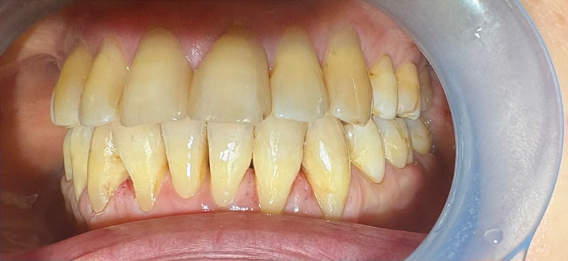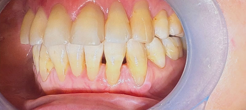 矯正後の60代後半女性で、下の前歯の歯茎下がりの空隙部位に食べものが入ってしまったり唾液が飛ぶから、封鎖したいという主訴でした。